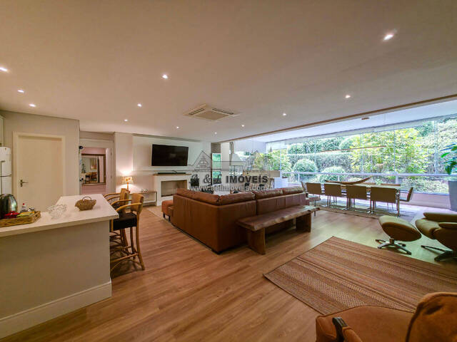 - Living distribuído em três ambientes, sendo duas salas de estar (uma com lareira a gás) e sala de jantar integrada;